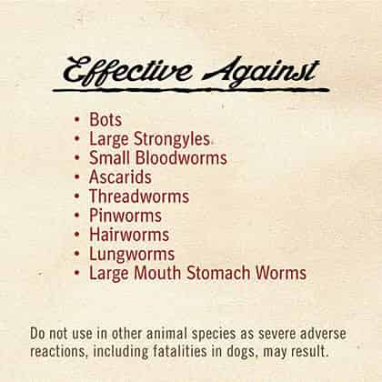 - Treats and controls large strongyles, small strongyles, pinworms, ascarids, hairworms, large-mouth stomach worms, bots, lungworms, intestinal threadworms, and summer sores.
