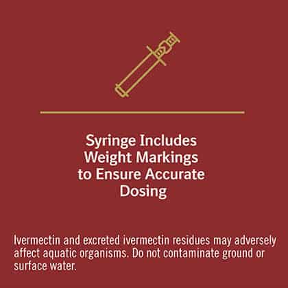| All weights | This syringe contains sufficient paste to treat one 1,250 lb horse at the recommended dose rate of 91 mcg ivermectin per lb (200 mcg/kg) body weight. Each weight marking on the syringe plunger delivers enough paste to treat 250 lb body weight. |