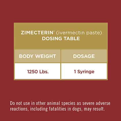 Zimecterin has been formulated specifically for use in horses only. This product should not be used in other animal species as severe adverse reactions, including fatalities in dogs, may result. Wash hands after use. Avoid contact with eyes.